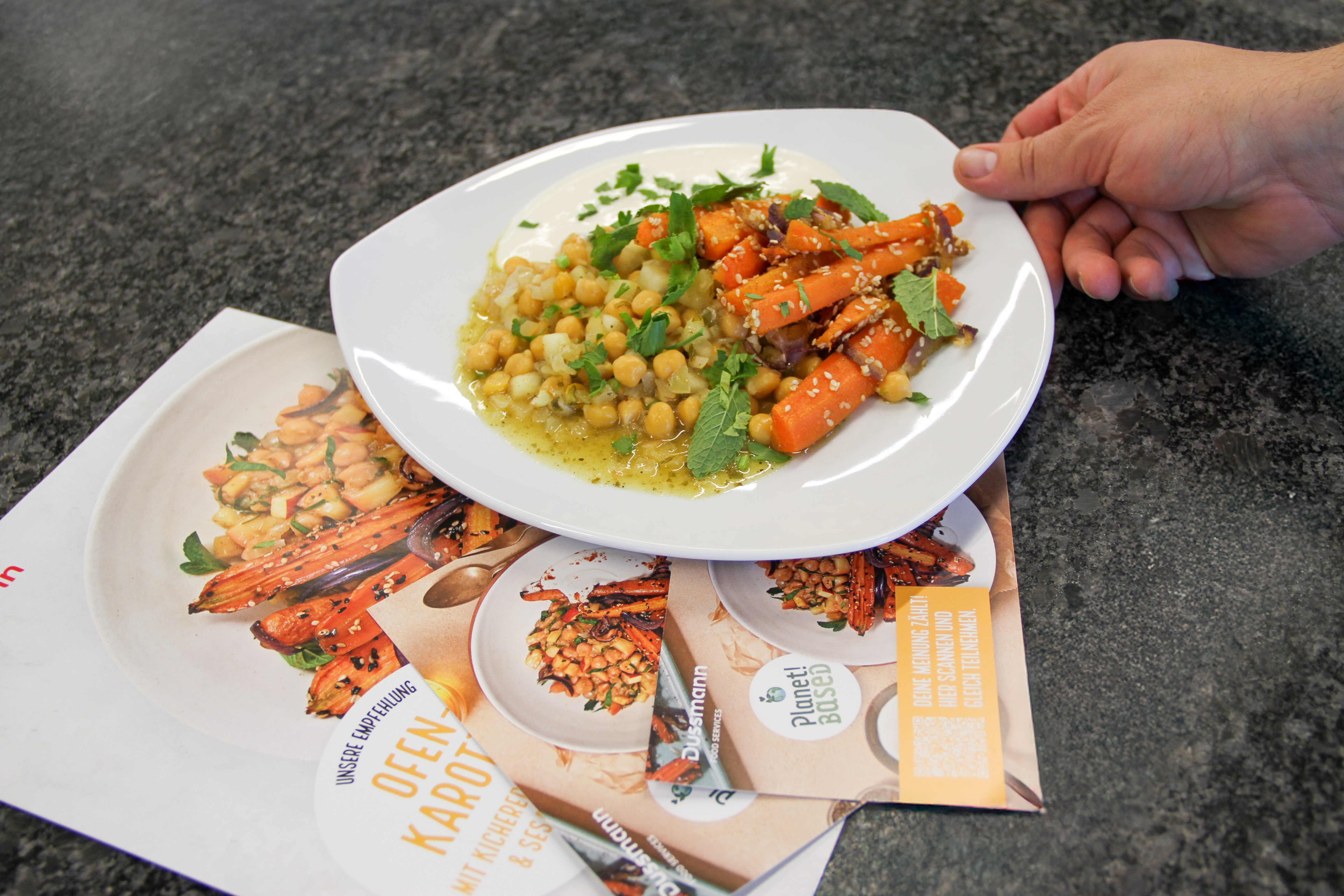 Unsere Ernährung verursacht ein Drittel der globalen Treibhausgasemissionen. Auf dem Weg vom Acker bis zum Teller werden für Anbau, Verarbeitung und Transport unserer Nahrungsmittel große Mengen an Wasser, Energie sowie fossilen Brennstoffen verbraucht. Dussmann ist sich als großer Player in der Gemeinschaftsverpflegung mit 90 Millionen Mahlzeiten jährlich seiner Verantwortung bewusst und hat daher die Menülinie Planet!Based entwickelt. Sie bringt klimafreundliche Gerichte auf den Tisch, die überwiegend aus pflanzlichen Zutaten bestehen. Tierische Produkte werden wohldosiert eingesetzt.